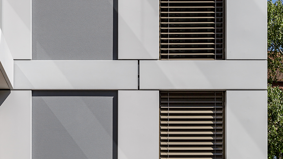 Use of de ProtectGuard® Color on GRC ZIP (Zanette Innovation panels) precast panels. Custom-made shade NCS 2500 in 100% opacity and Agathe in 10% opacity emphasizes the beauty of the building.